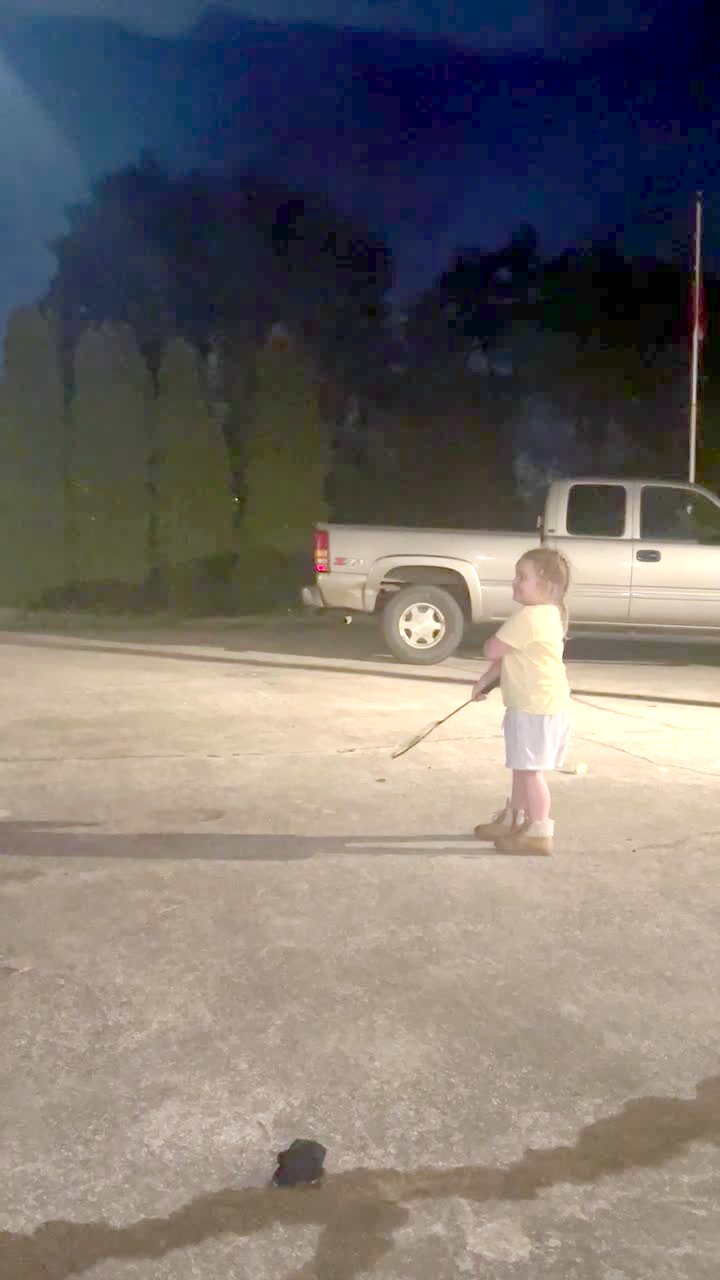 A young girl shoots a basketball at a hoop in the driveway and misses. The ball bounces back and hits her in the head. Night.