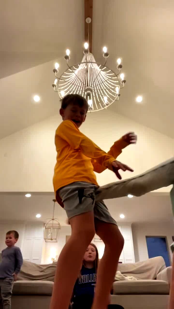 A young girl does a cartwheel and a young boy tries to run into the frame and she accidentally kicks him in the groin and he falls in the living-room. Slow motion.