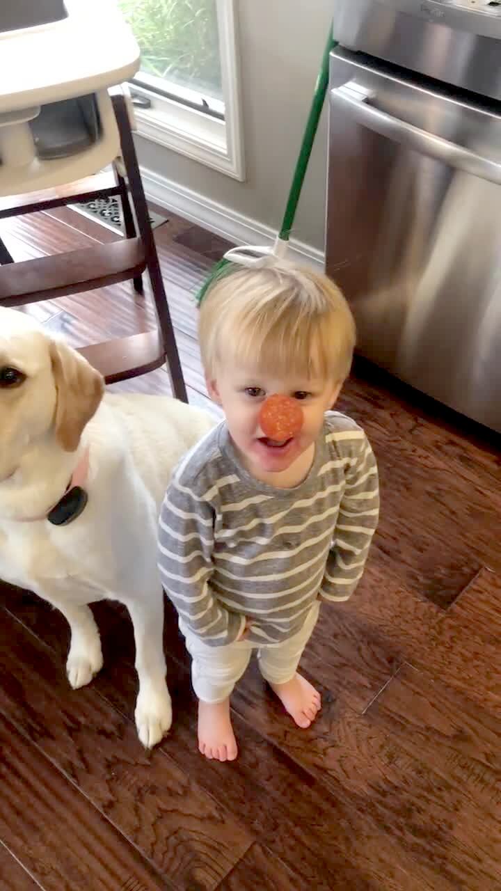 A dog sits in a kitchen and a tot boy stands next to him. They balance pepperoni pieces on their noses. Their dad says to eat the treats, and the dog and tot drop the pepperoni from their noses, and eat it.