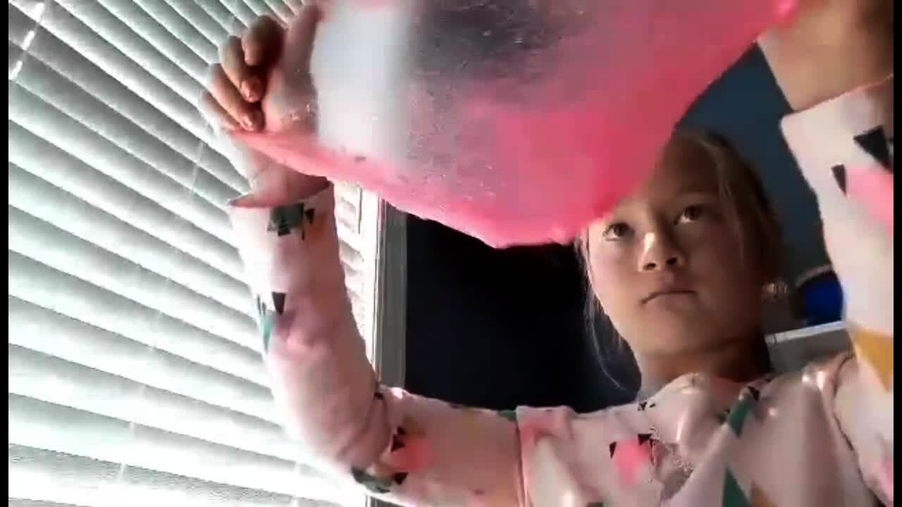 A young girl shows off her slime and falls off the table and into the window blinds.