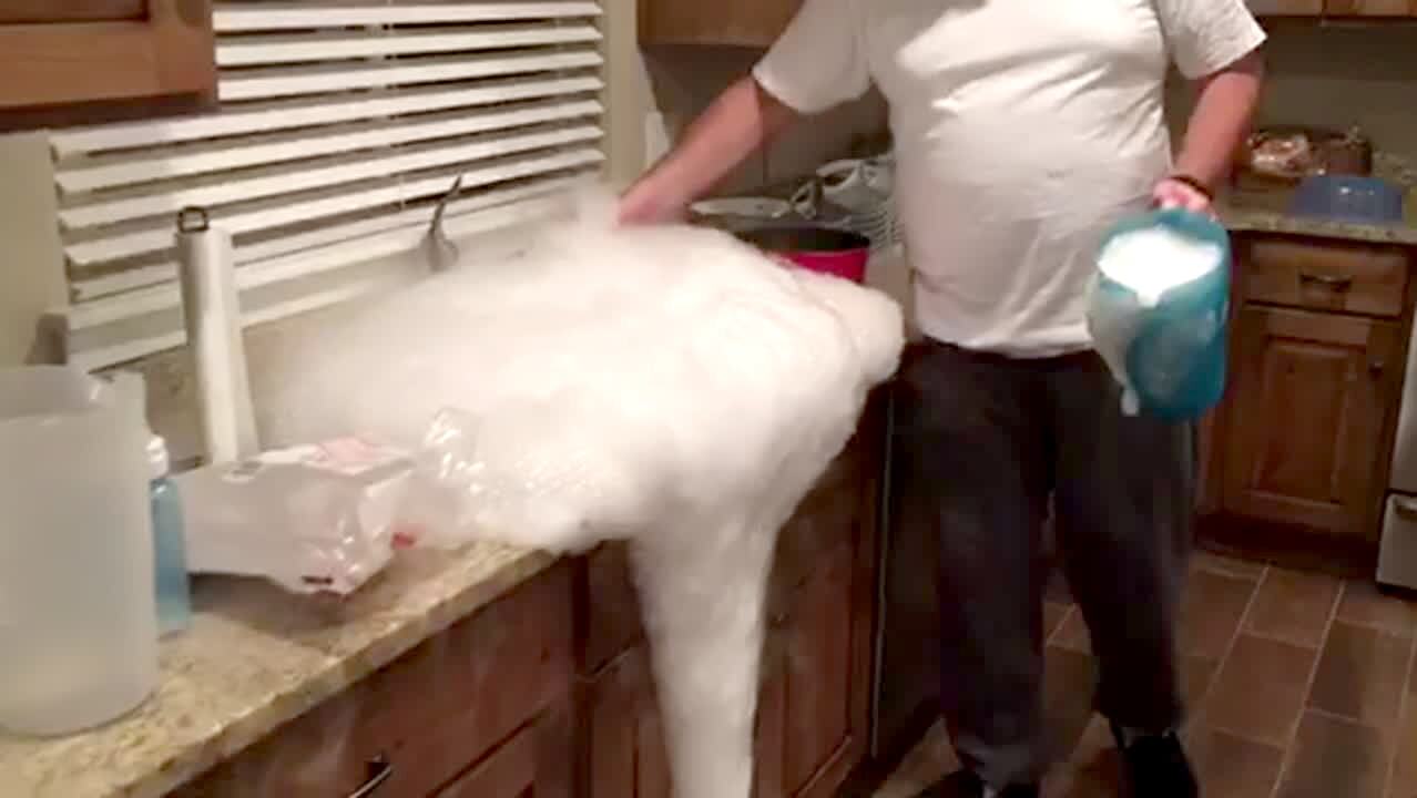 A man puts dry ice in a soap filled sink and it fizzes up and goes everywhere.