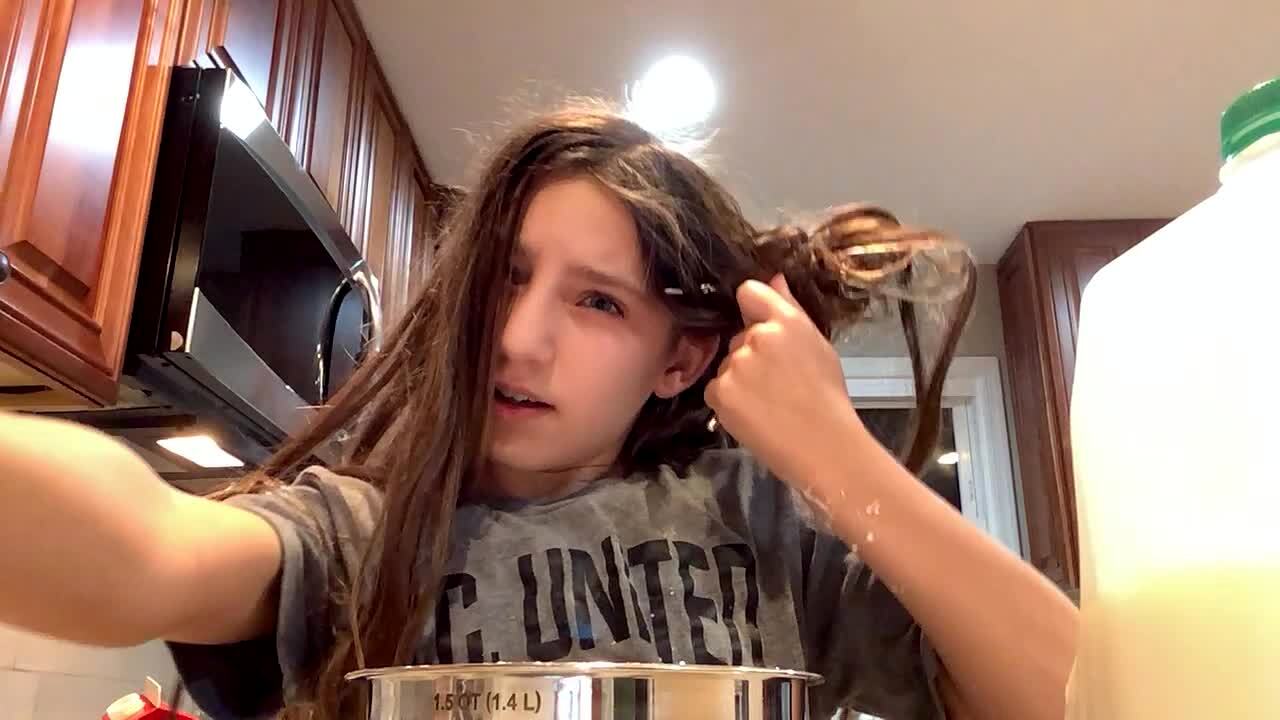 A woman screams in the kitchen as her hair is stuck in a Kitchen-Aid mixer. Someone stops it and they get her hair out of it.