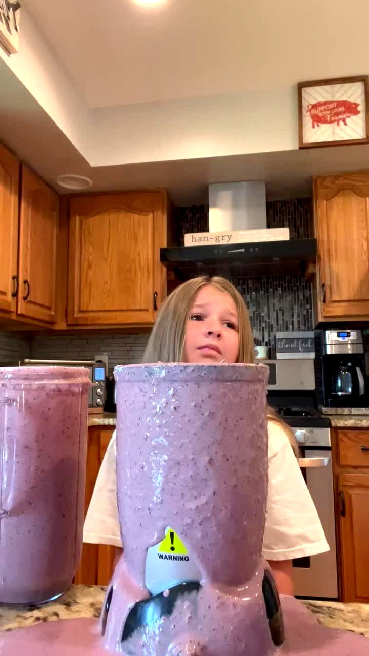 A young girl uses a juicer but the lid comes off when she pulls it off. Her smoothie spills everywhere and causes a mess.