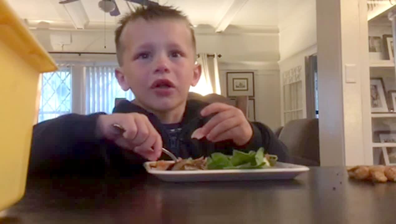 A young boy sits down to eat a bowl of cereal on a tray table in a living room, then the tray table breaks, and he yells "come on." Security footage.