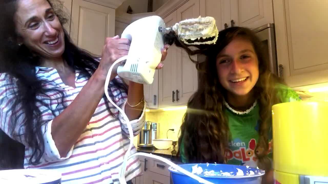A young girl talks to the camera and bakes with her dad in a kitchen. She uses an electric mixer in a bowl. Her hair gets caught in the mixer and she laughs.