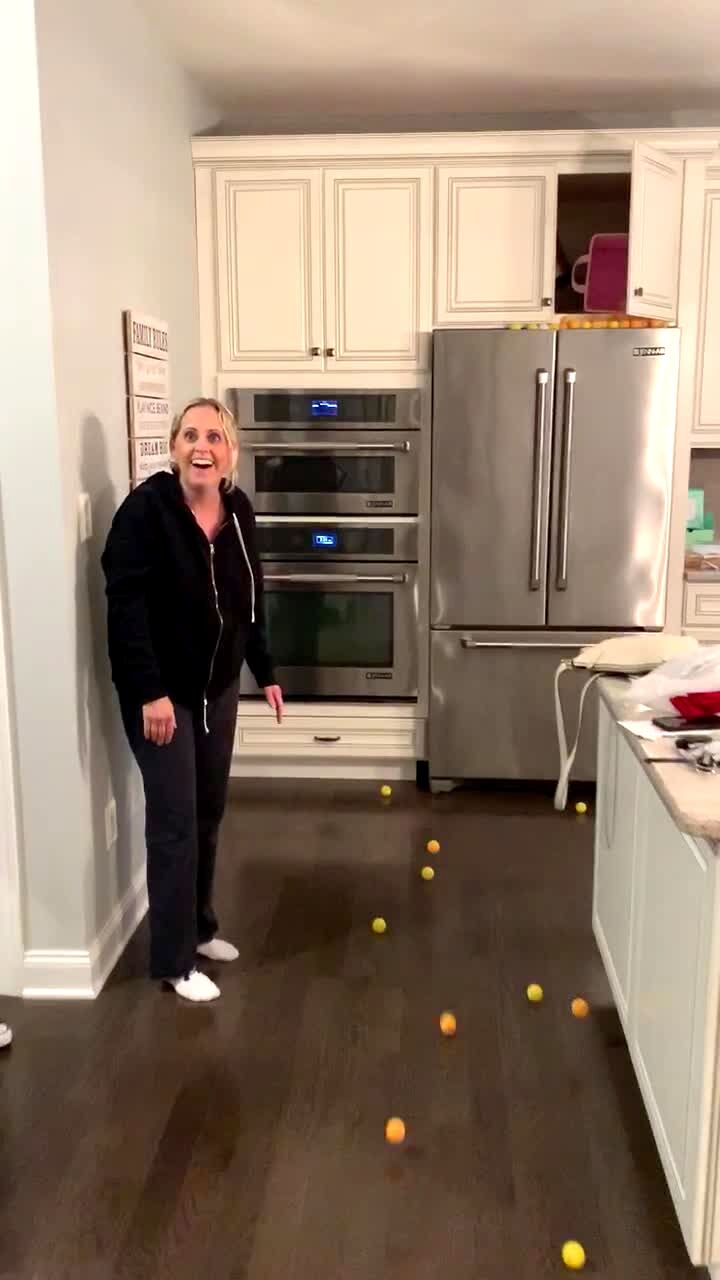 A woman says "get out of there" in a yard through a security camera, then a raccoon pops its head up from inside a trash can and leaves. Security footage.