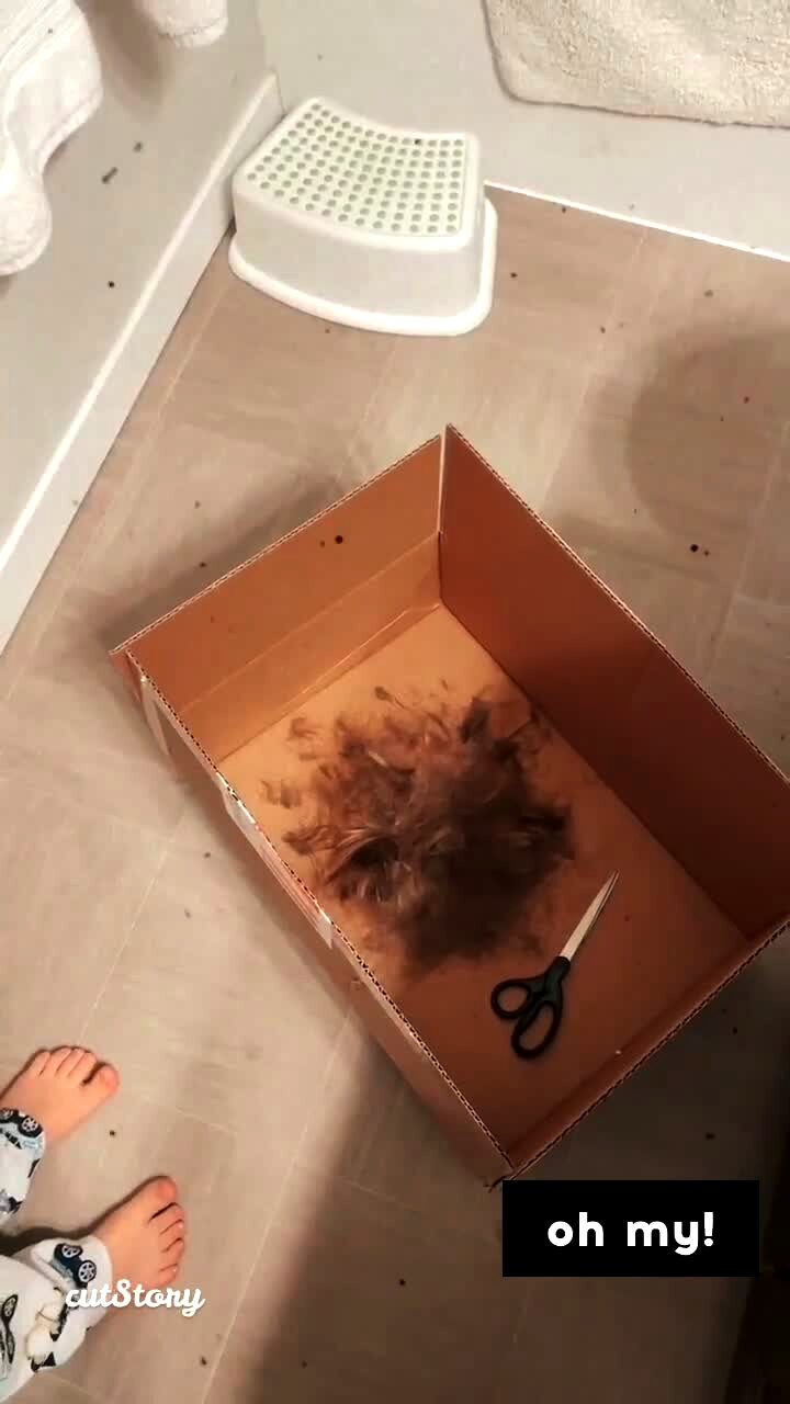 Tot boy has shaved half of his head with dad's beard trimmer. Hair.