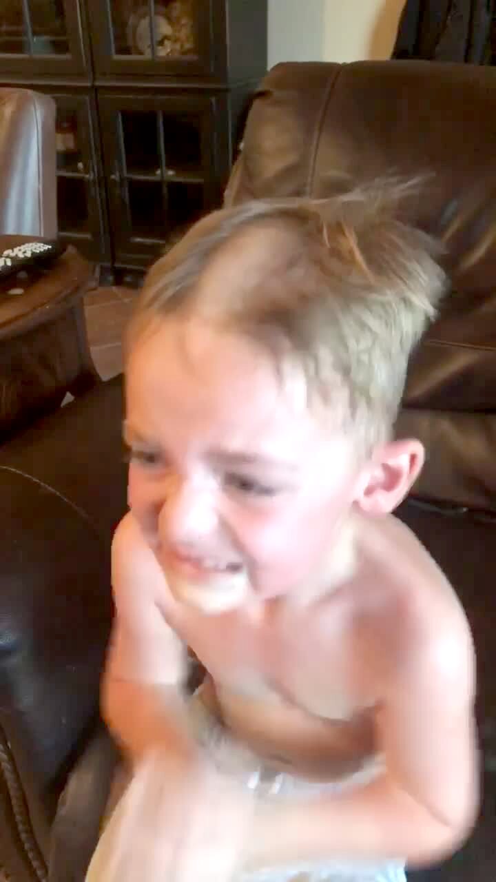Tot boy laughs when getting hair cut with clippers. Funny laugh.