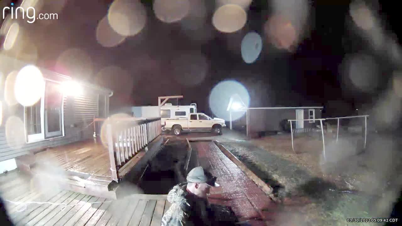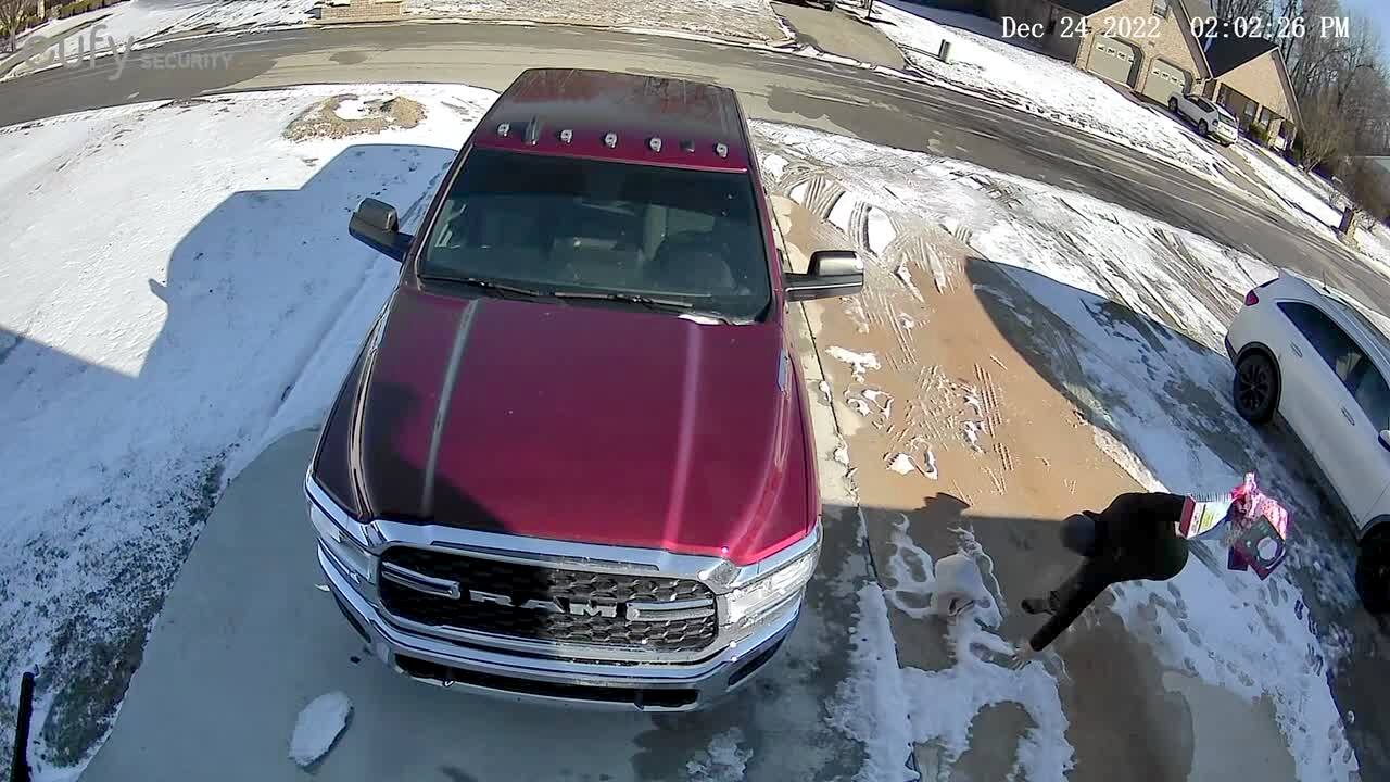 A man slips and falls on ice on a driveway, then farts. Security footage.