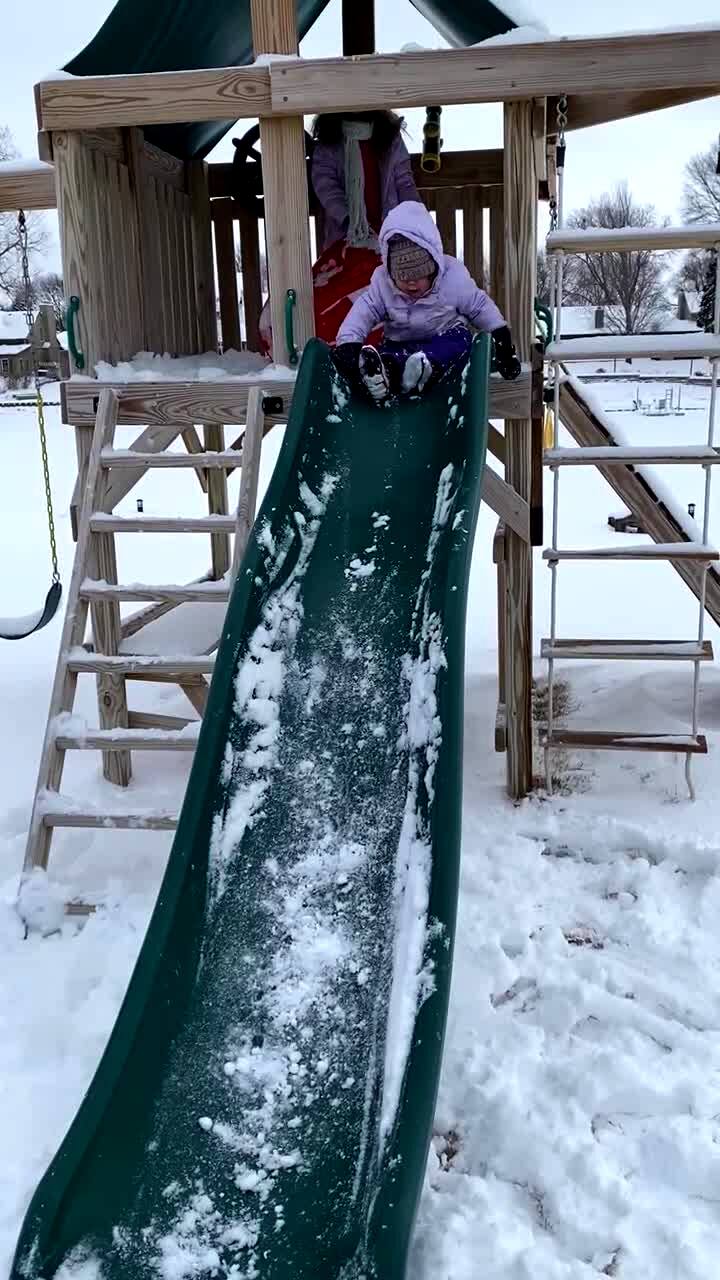 A young girl reacts with excitement as she holds a large icicle then it slips out of her hands, bonks her in the face and says "Now it's all gone" outside.