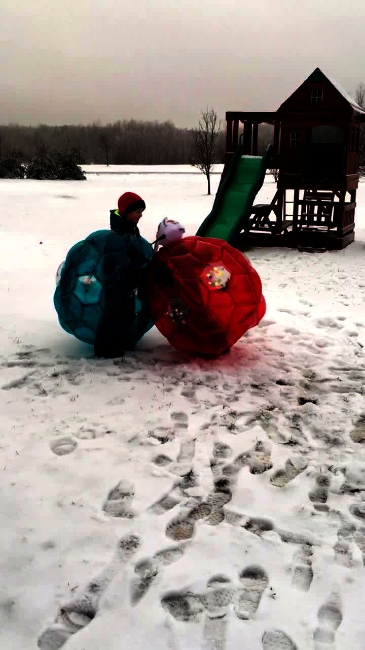 A dad tries to walk down a winter icy driveway but slips and slides, and struggles to not fall. He walks down an icy street sidewalk and his wife and two young daughters laughs hysterically.