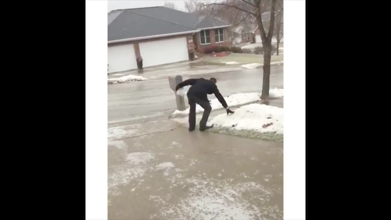 A man slips and falls on ice on a driveway, and throws his phone by mistake. Security footage.