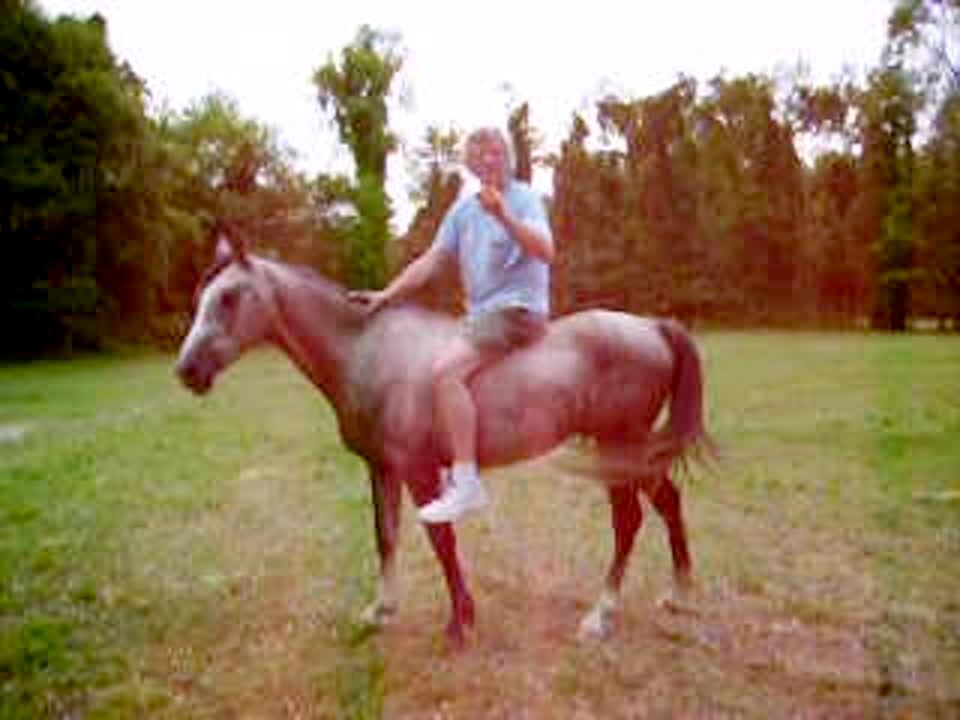 A man climbs onto a horse in a field and falls off the other side and the horse runs away.