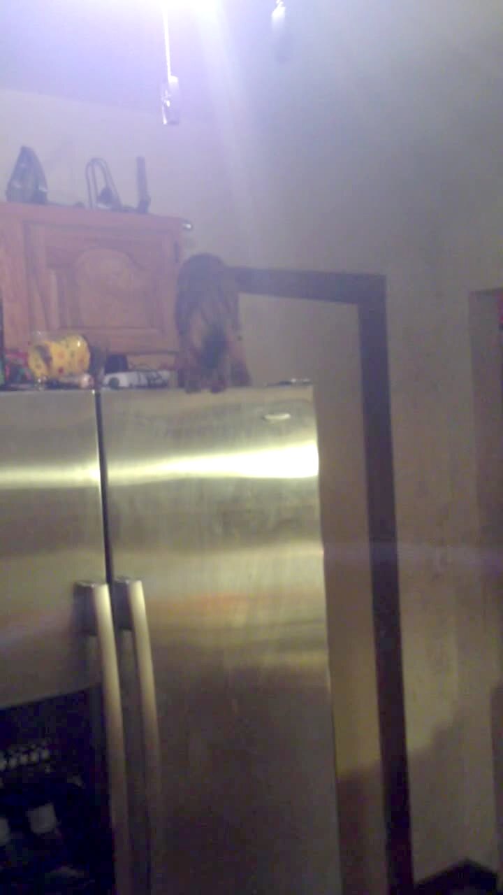A cat jumps onto a ceiling light in a kitchen and makes it swing, then falls off of it. Security footage.