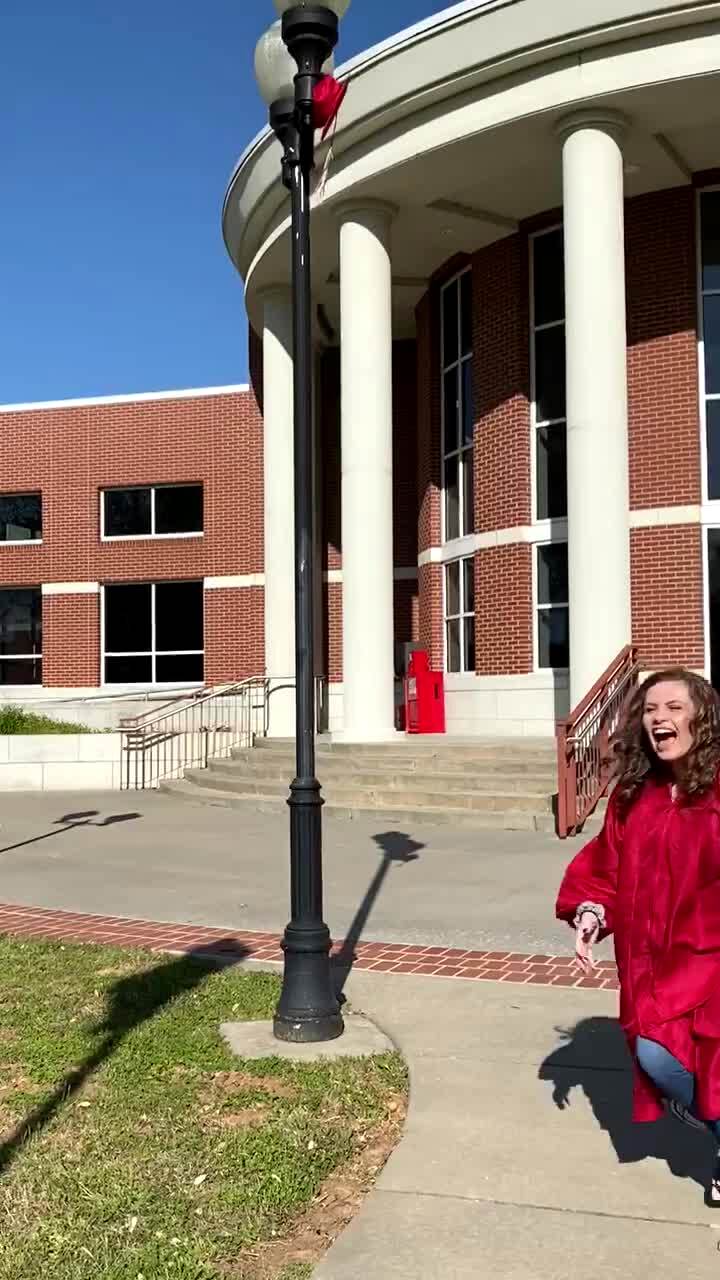 A teen girl at a school celebrates her graduation and throws her graduation cap in the air and the wind blows it and it gets stuck on top of a lamp post.
