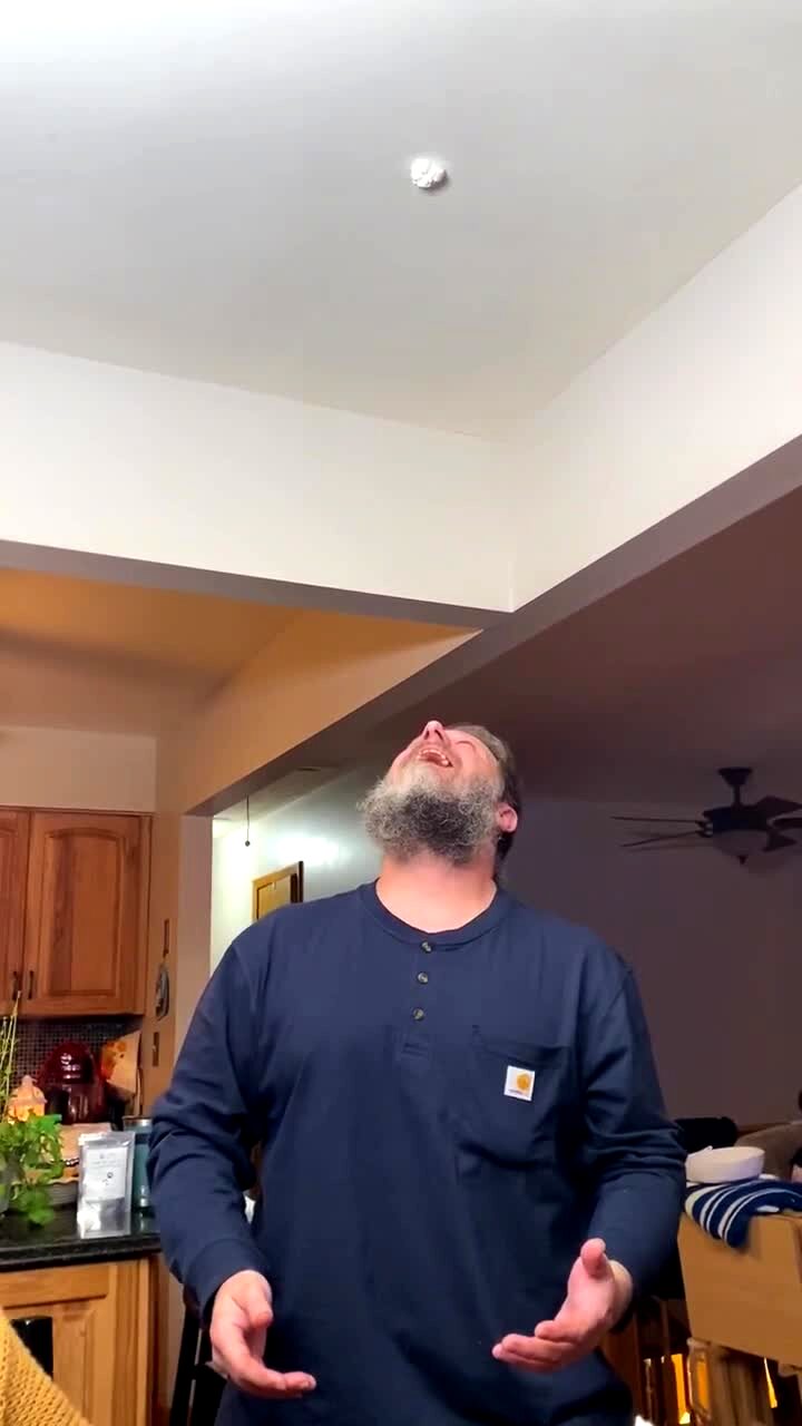 A man struggles to catch a snowflake and hits his chin on the truck in the driveway. Security footage.