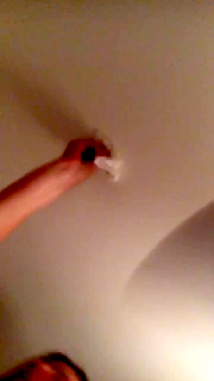 A woman in a cabin uses a tissue to grab a spider on the ceiling and the ceiling fan hits her in the head.