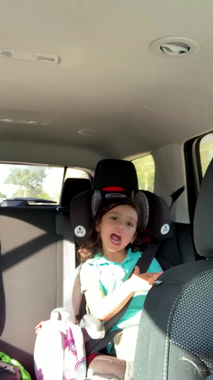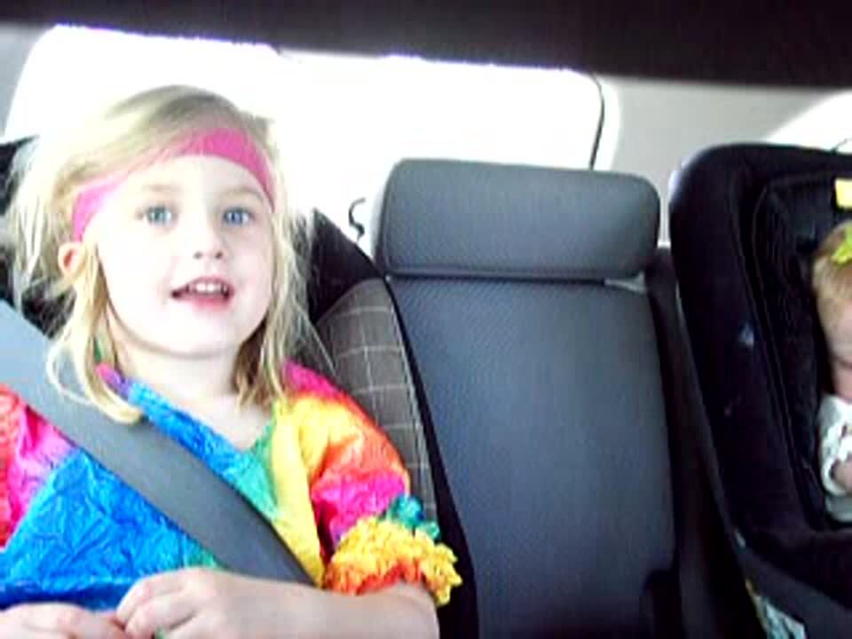 Little girl in the back of the car with tot sister. little girl says she wants to drive. Man driving says "if i let you drive who is gonna work the pedals?" there is a quiet moment. then the tot girl in her carseat begins to raise her hand. She says "me" ever so cute.