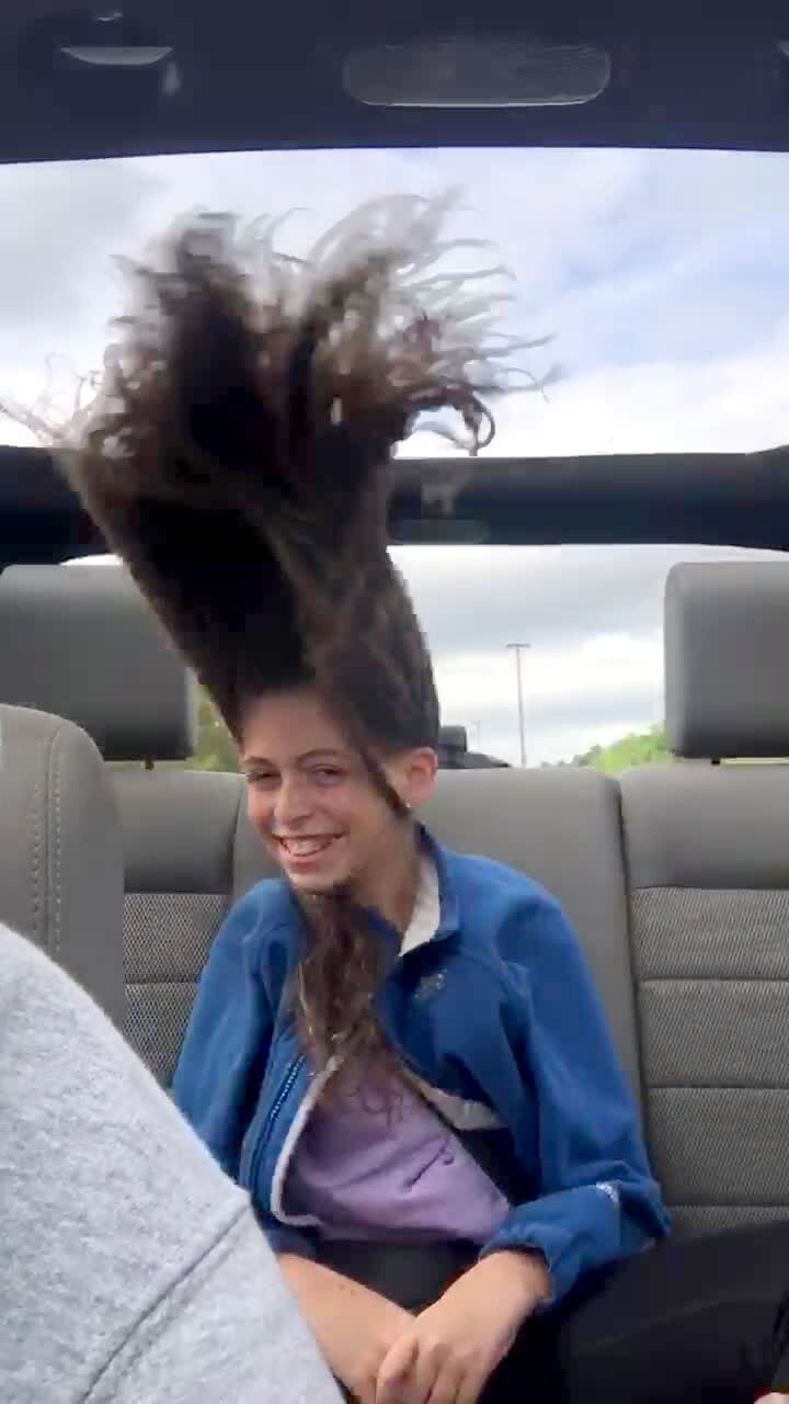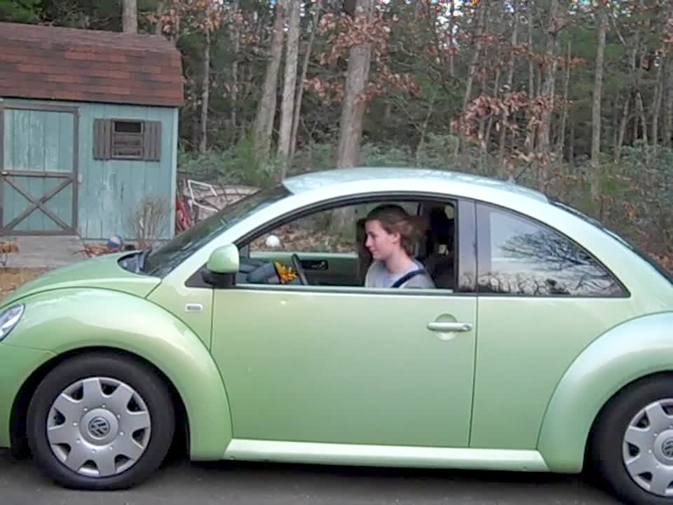 Teen girl is about to drive her first car for the first time, a brown dog jumps into the window as she's about to pull out of the driveway.