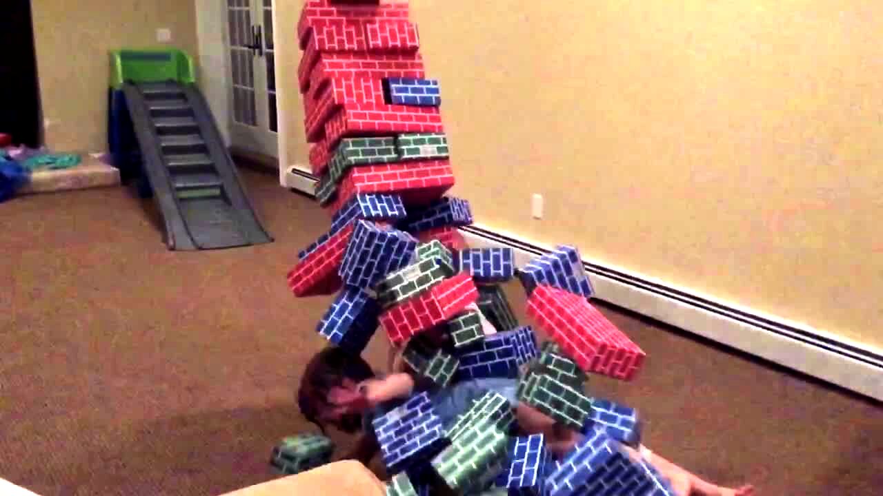 A young girl and a tot girl ride a car down a toy slide and crash into a tower of blocks in slow motion.