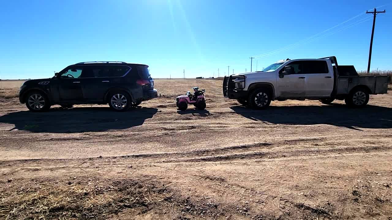 A young girl rides a toy car outside. A woman asks her, "Are you going to parallel park?" The daughter then parallel parks between a SUV and a truck but it's actually her dad off screen that drives the car with a remote controller.