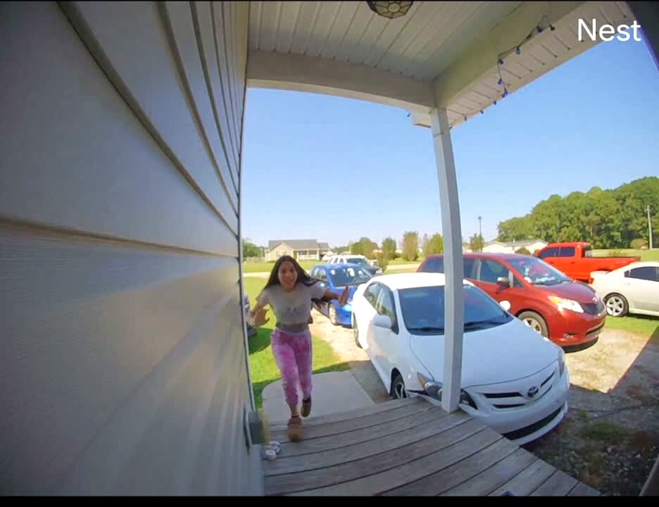 A teen girl turns on a car and drives it forward into another car on a driveway, and the front car crashes into the porch. Security footage.