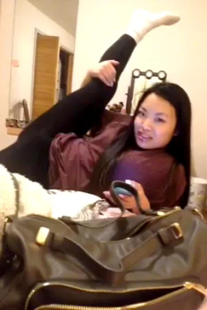 A teen girl in a bedroom lip syncs and dances on a bed and hits her head on a ceiling fan.