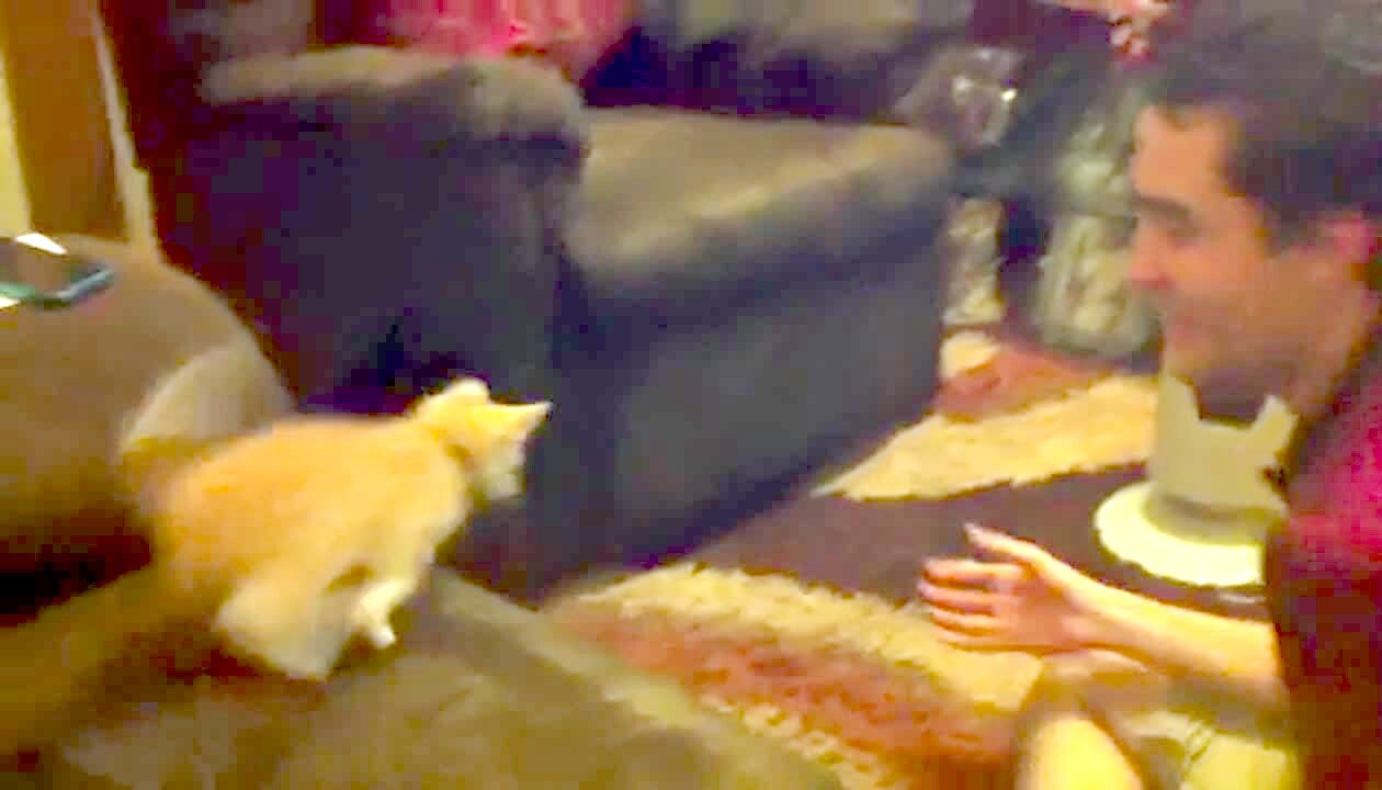 An off-camera father calls his young son out to the garage and tells him to hustle and the boy runs into a piece of tape stretched across the door and it wraps around his head.