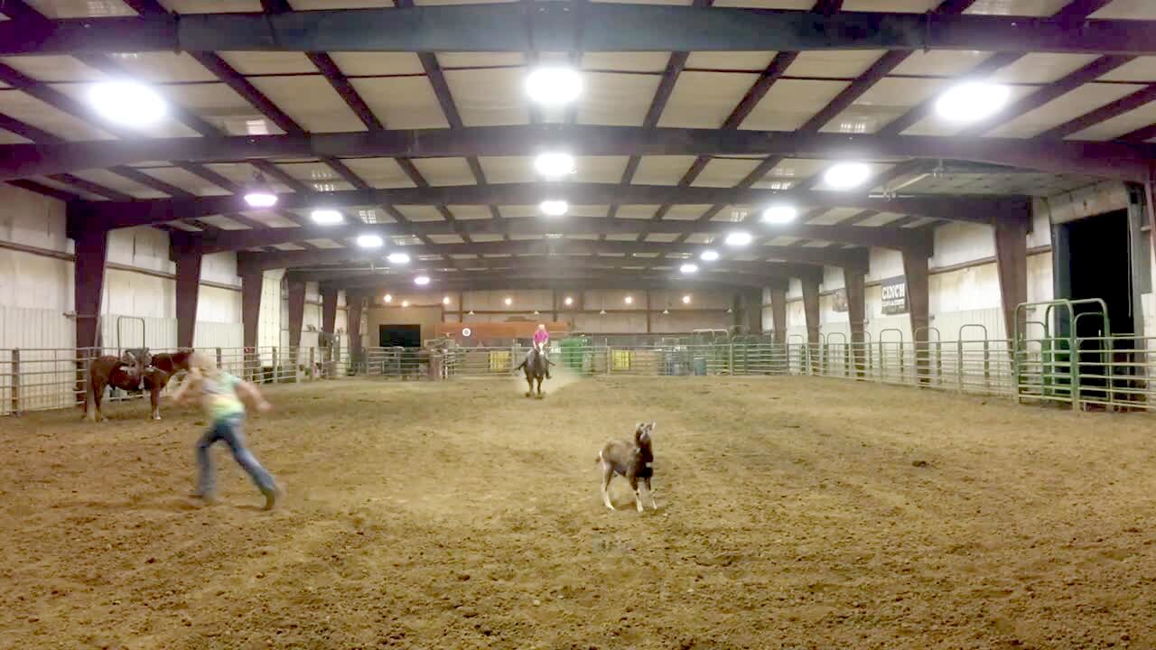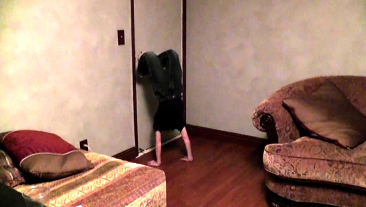 A man driving an ATV into a garage accidentally accelerates and the four wheeler flips and slides across the floor. Security footage