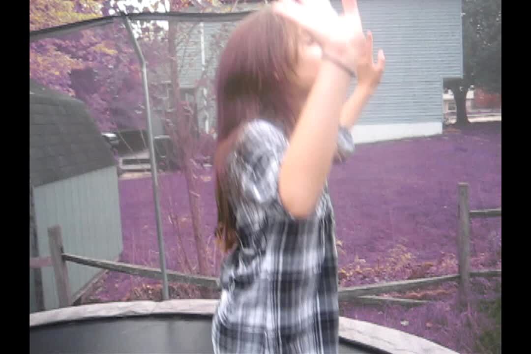A teen girl jumps on a trampoline outdoors, it rips, and she falls to the ground in slow motion.