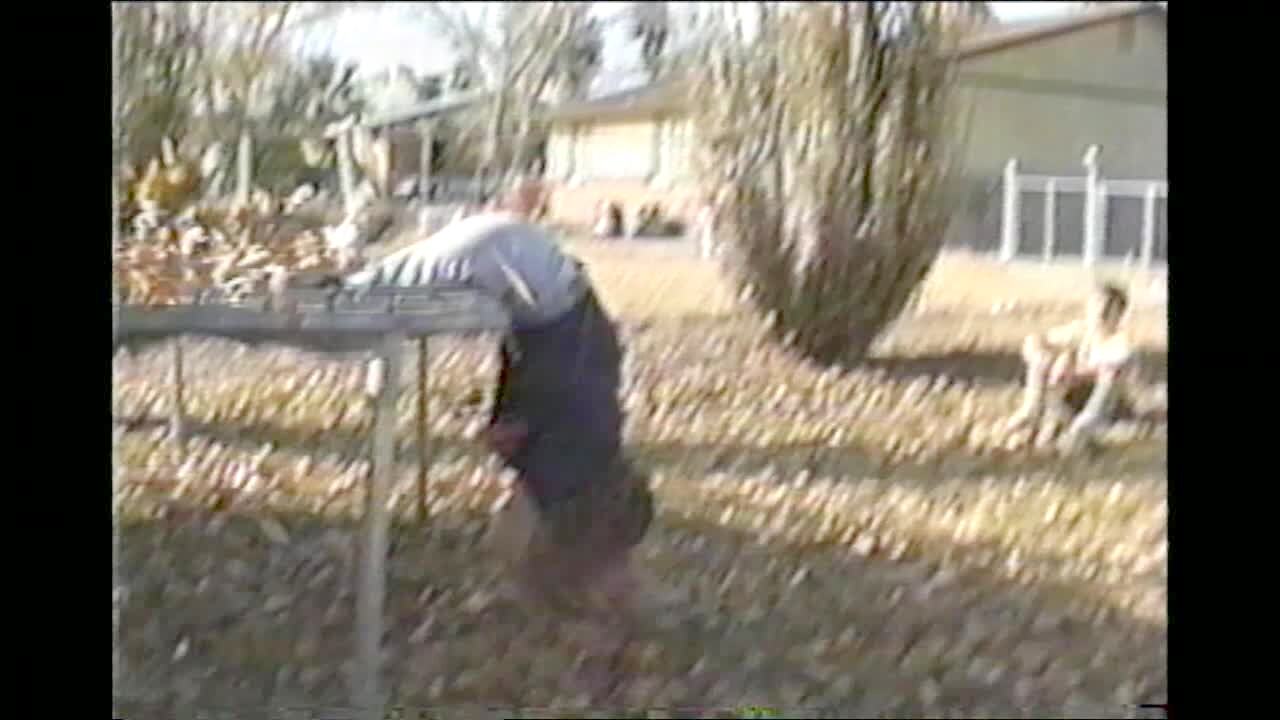 A young girl does a back flip on a trampoline and falls out of a hole in the netting at :11.