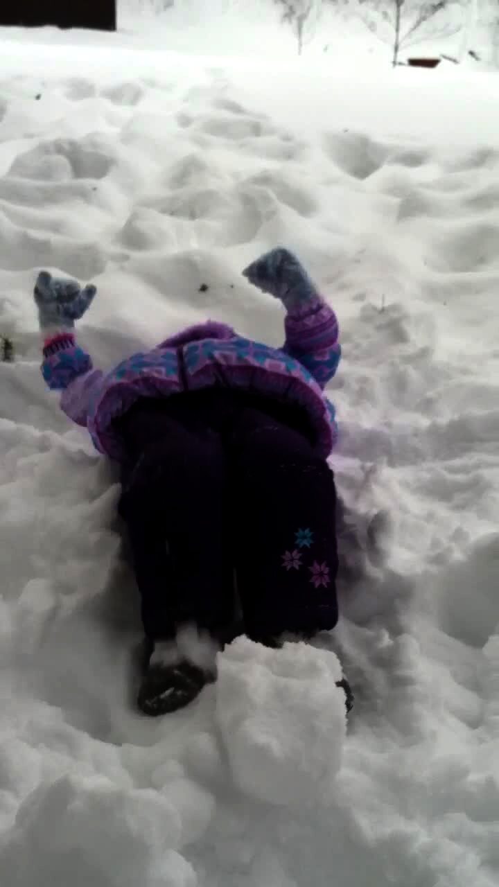 A man throws a tot boy into deep snow outside, and the tot boy disappears into it, then he yells "I'm okay."