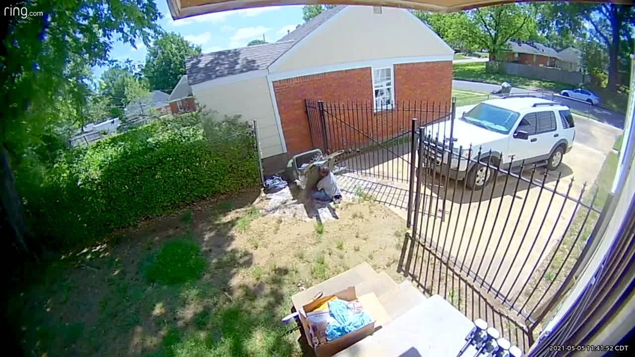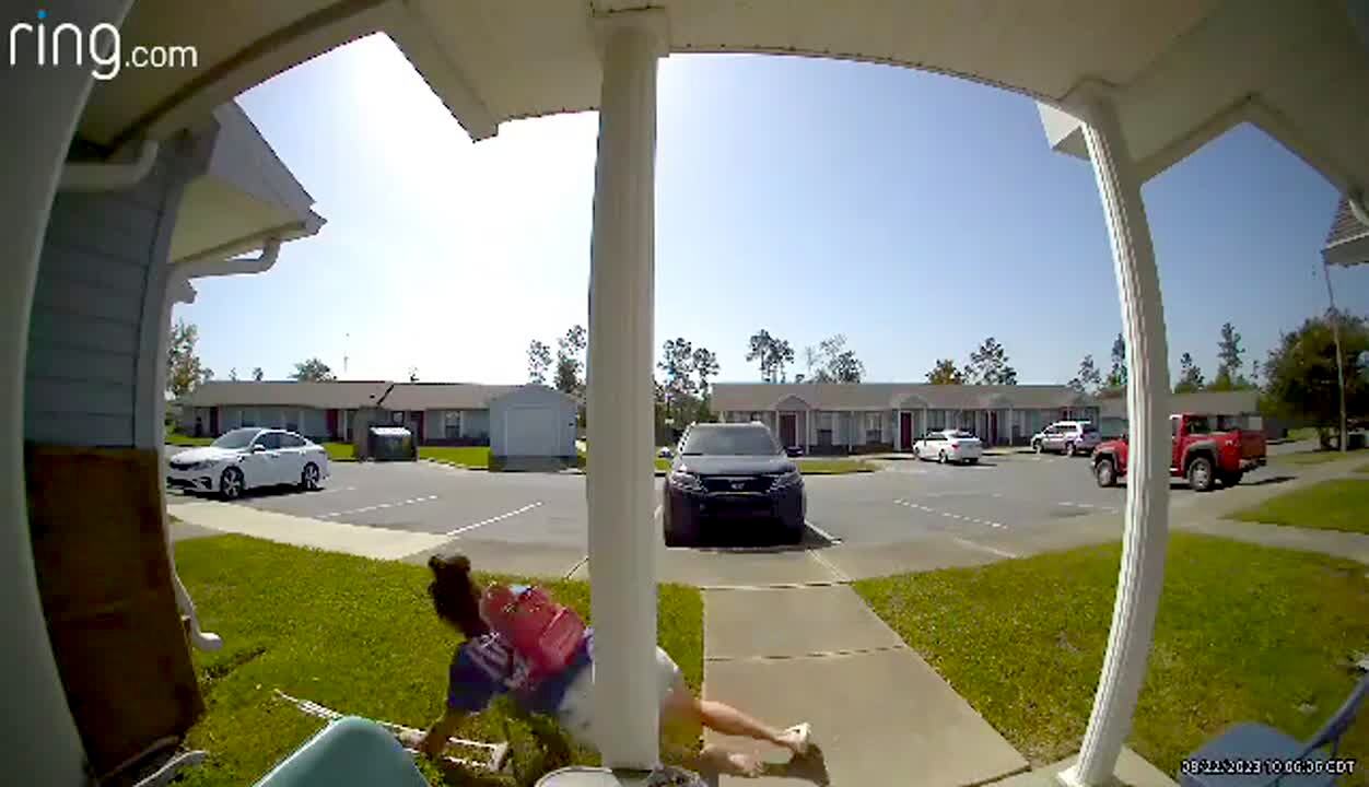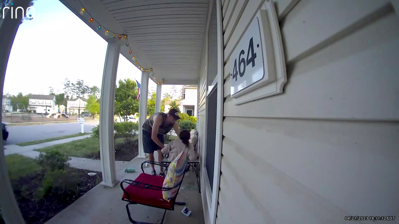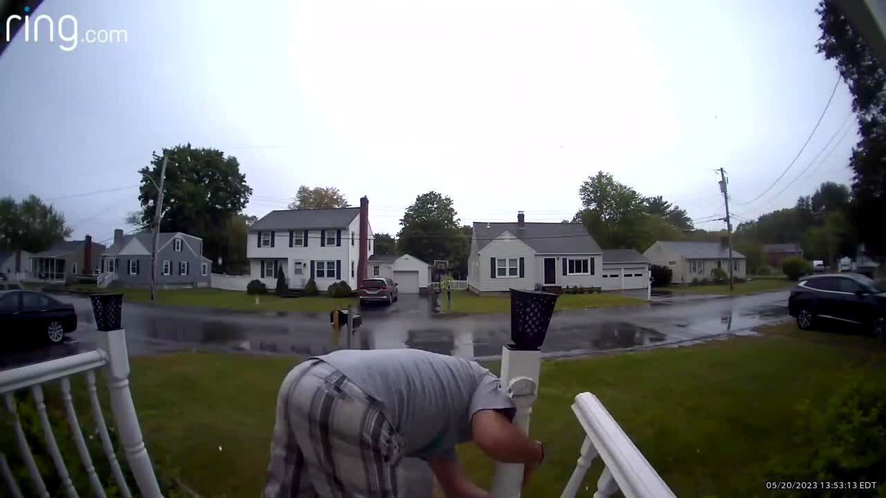 A man takes a whole front porch down with him when he stumbles and falls after he steps out into a rainy yard. Security footage.