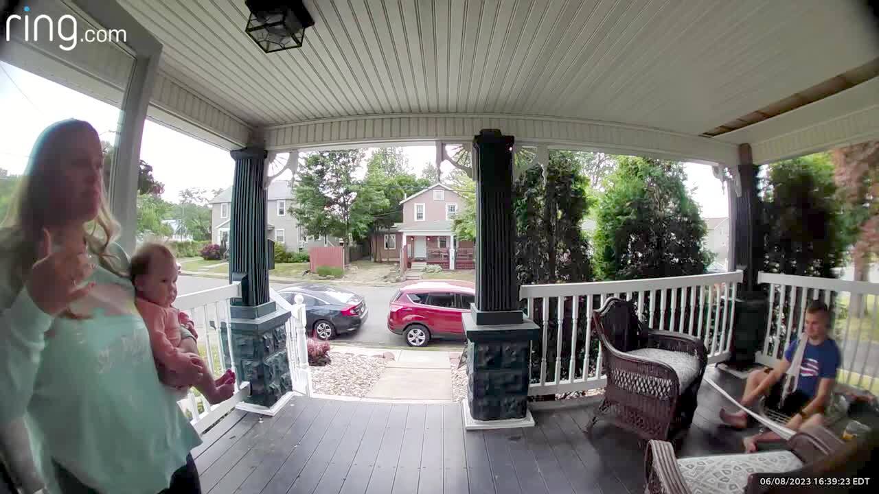 A woman runs down the driveway to try and catch her husband before he drives away when she stumbles and face-plants onto the driveway. The man gets out to help her but forgets to put the vehicle in park. Then the car starts to roll down the street with their kids inside of it, as he runs to jump in and stop it." Security footage.