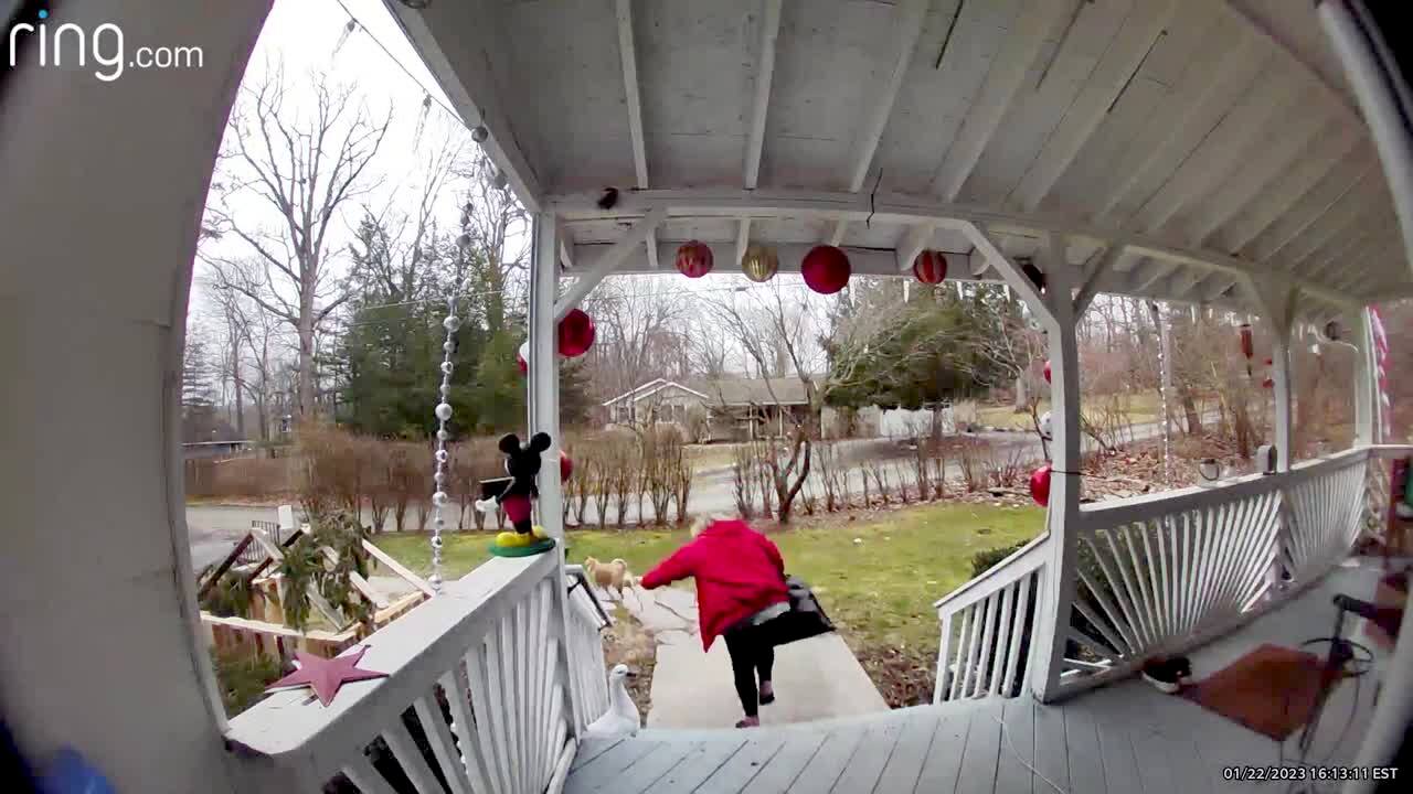 A woman tries to pull a dog tethered to the front-porch into the house but the dog walks back and forth and runs into the yard. She gets caught up in the rope and trips and falls. Security footage.