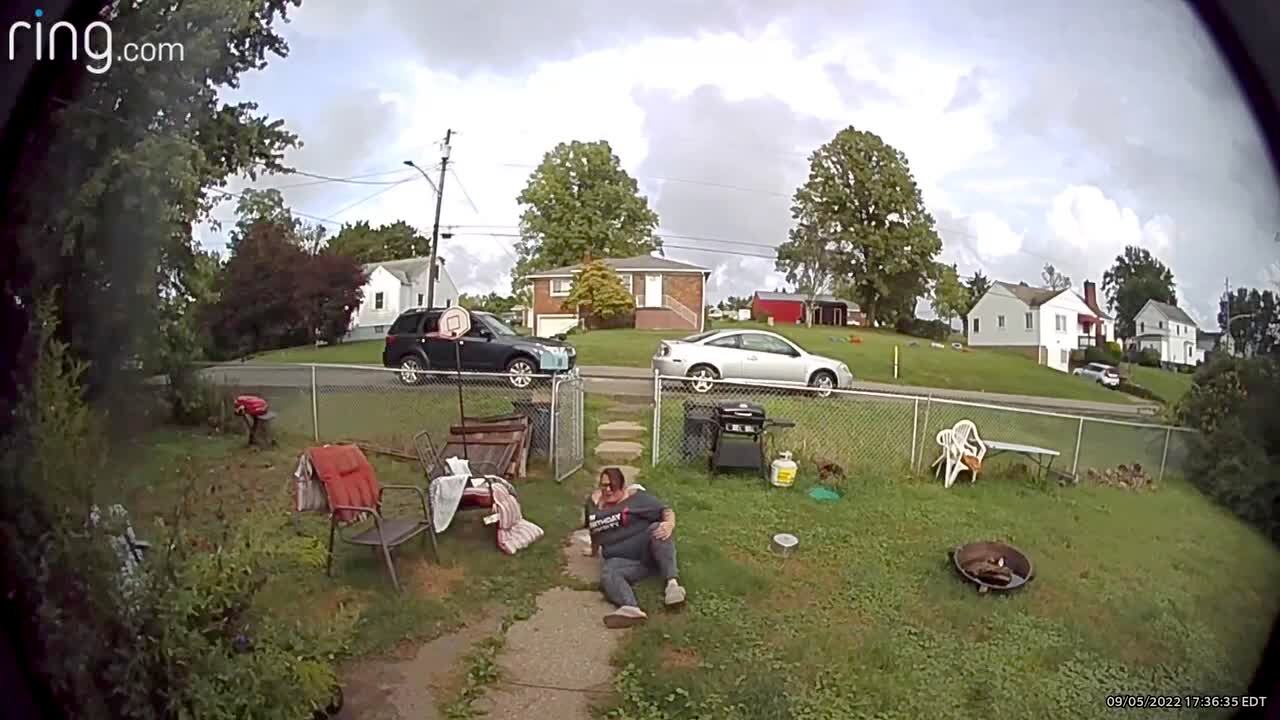 A woman stammers and stumbles until she drops to the ground as she tries to take garbage out into a front yard. Security footage.