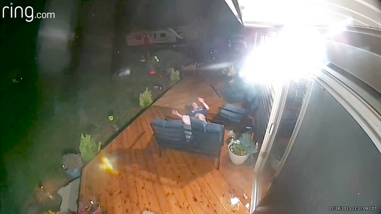 A woman attempts to put furniture in place on a windy and stormy evening when the patio couch slides into her and takes her down. Security footage.