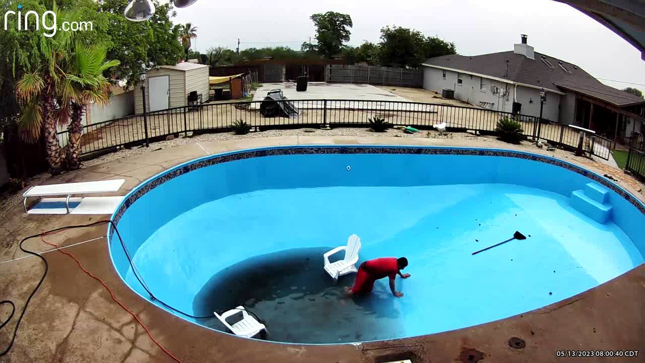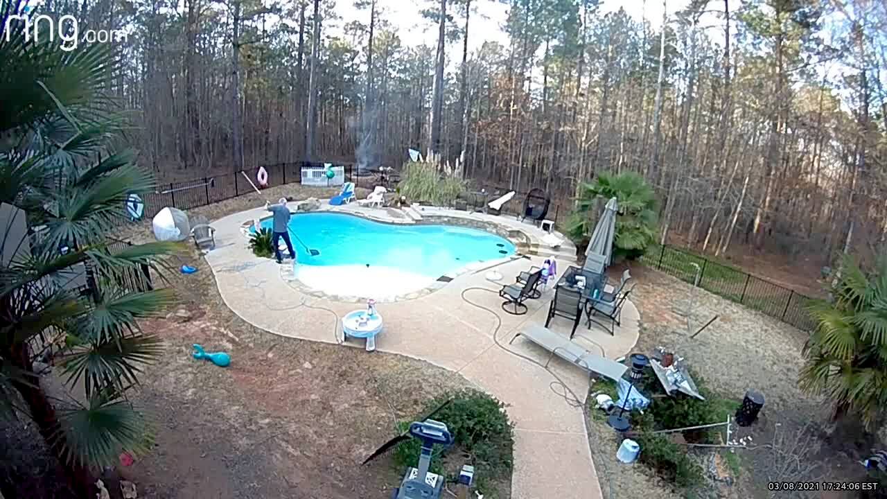 While she tries to help her husband with construction on the patio roof, a woman climbs up a ladder and loses her balance. She falls to the ground and rolls into a swimming pool. Security footage