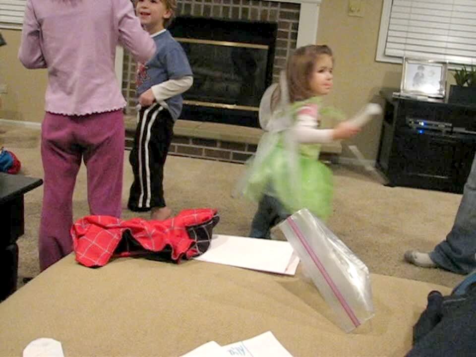 A young girl dances in the kitchen. A man runs and slides on the floor in front of her and hits the counter and falls. Music rights not cleared.