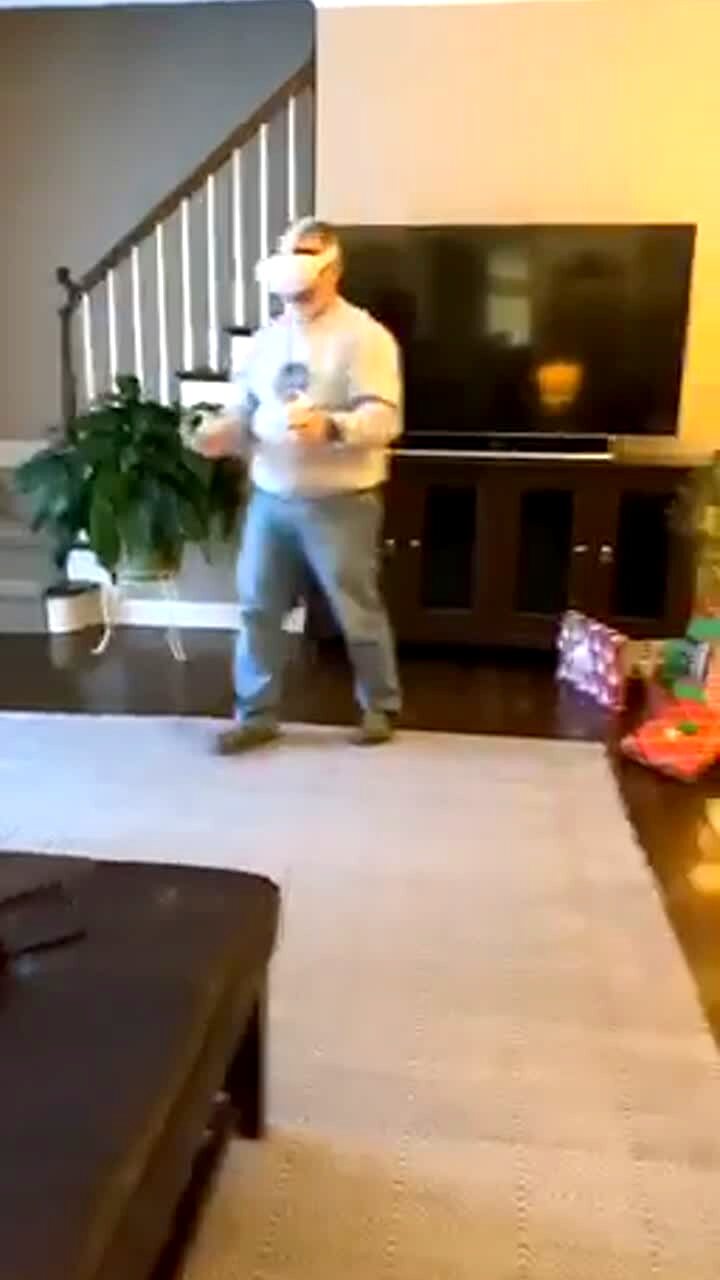 A man plays a virtual reality video game in the living room and runs into a window and falls back.