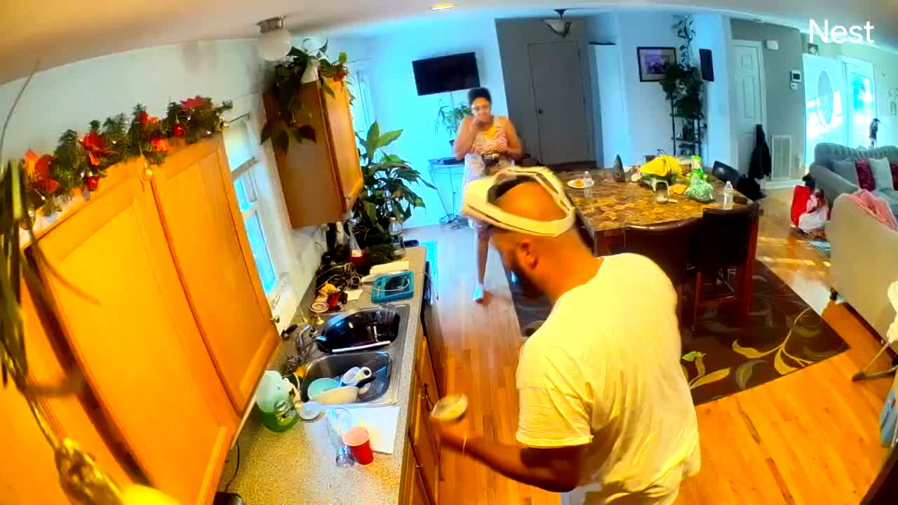 A man in the kitchen wears a virtual reality headset and plays a VR game. He runs straight into the cabinet. Security Footage. Music rights not cleared.