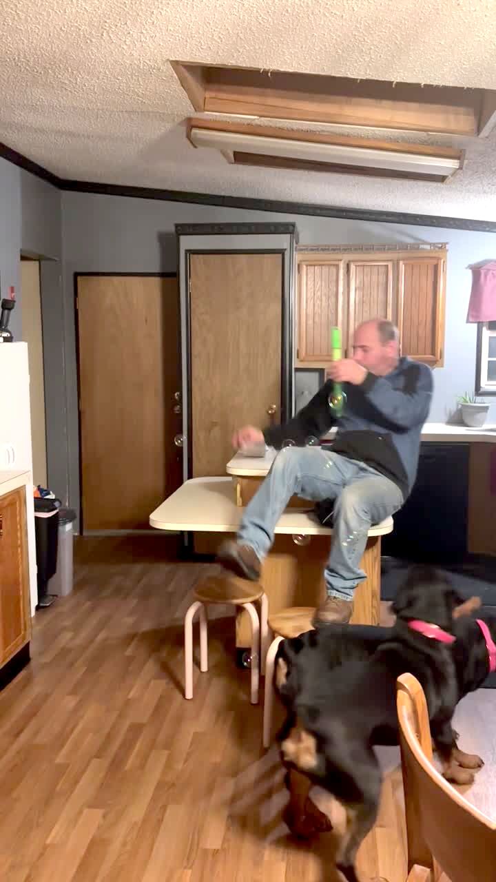 A man blows bubbles for two Rottweilers while he stands on a stool in a kitchen. One of the dogs jumps up and knocks him over.