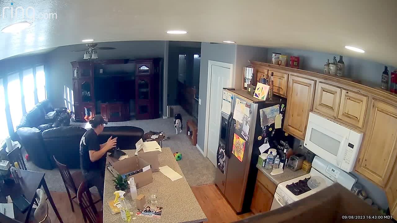 A young man walks up a flight of stairs to his house and drops a drink, but he catches it before it spills. He sets it down and adjusts pillows on a chair, then knocks it over with the pillow and spills it. Security footage.