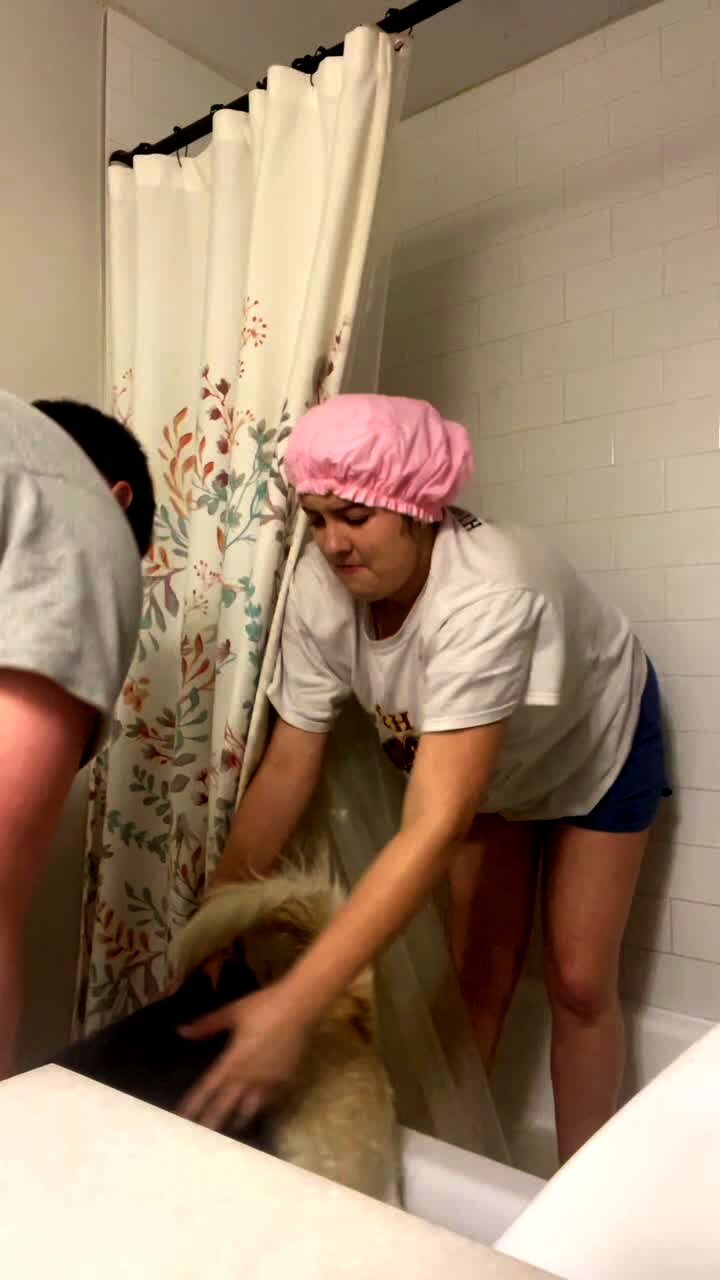 A man and woman wash their dog in a bathroom, then he gets away when the man tries to dry him. The woman falls back into the bathtub and takes the shower curtain down with her.