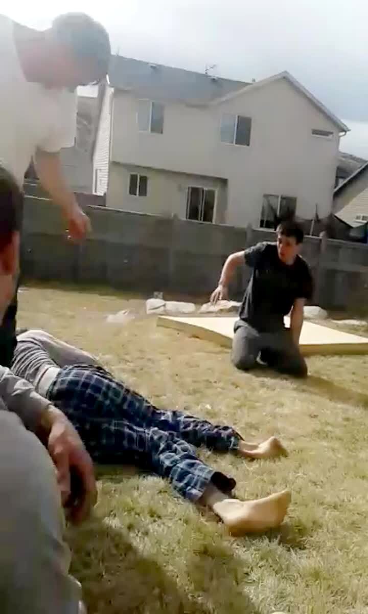 A young girl holds an English Bulldog dog on a leash in a yard and a man blows the dog in a face with a leaf blower. The dog tries to bite the leaf blower and his flips flap in the wind.