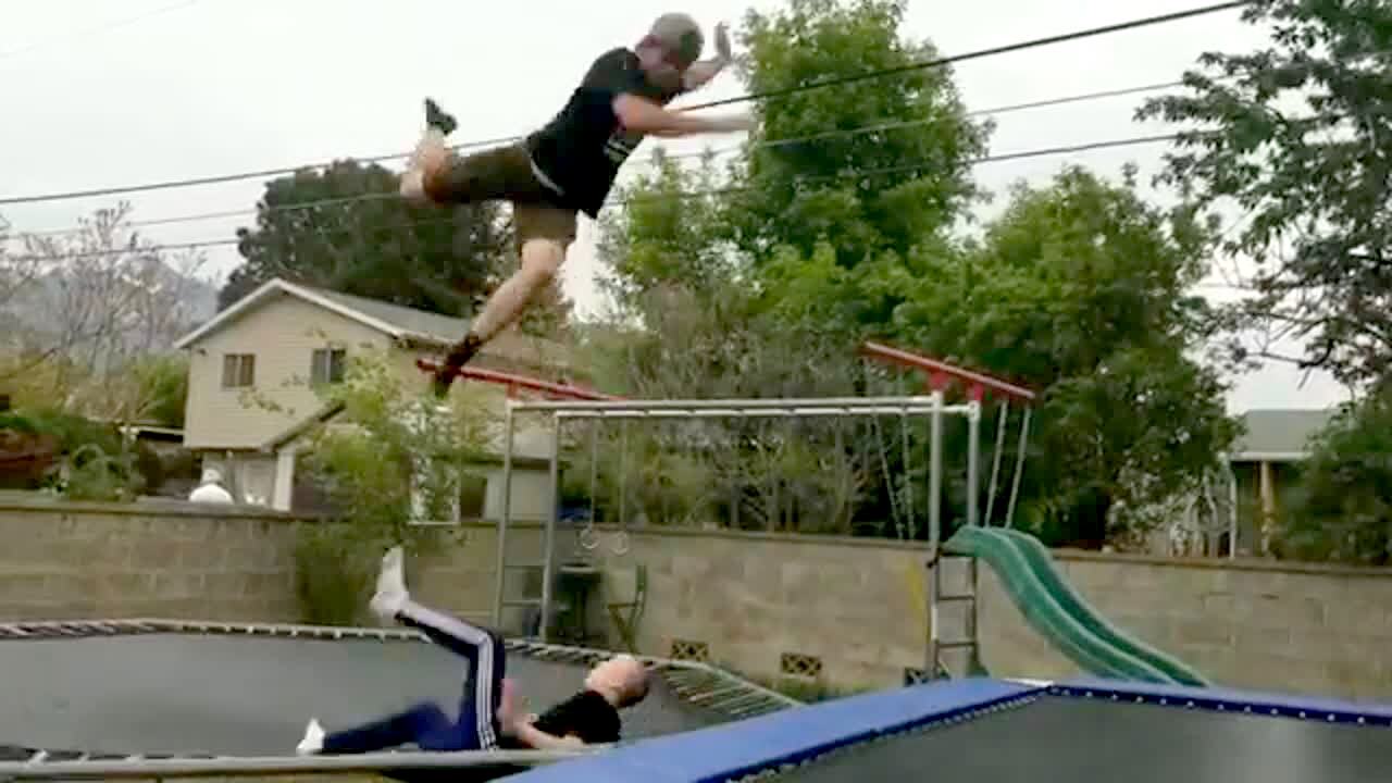 A young man lists off some safety tips before he zip lines in a yard, then the rope breaks, and he falls down.