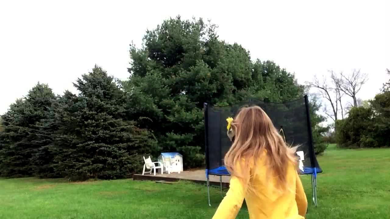A teen girl refers to herself as "the next cheerleader" in a kitchen, then she kicks her leg up high and falls. Music rights not cleared.