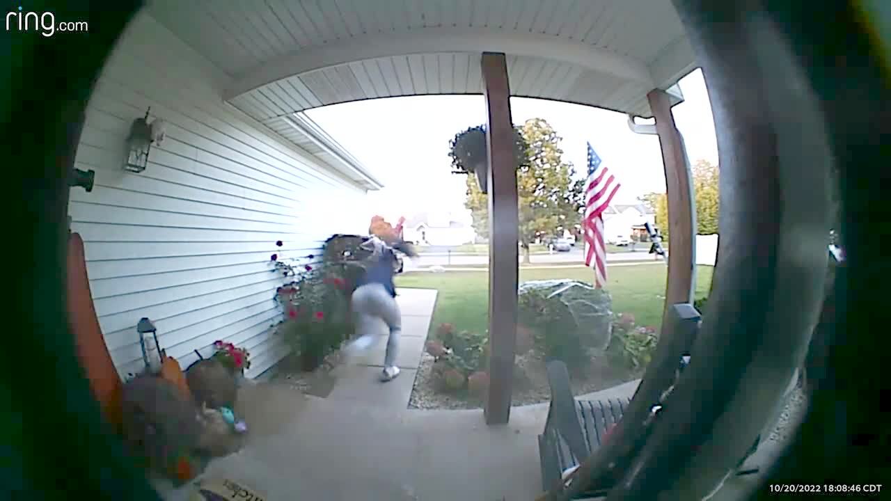 A teen boy rings a doorbell and runs away, but he trips and falls in the yard. Security footage.