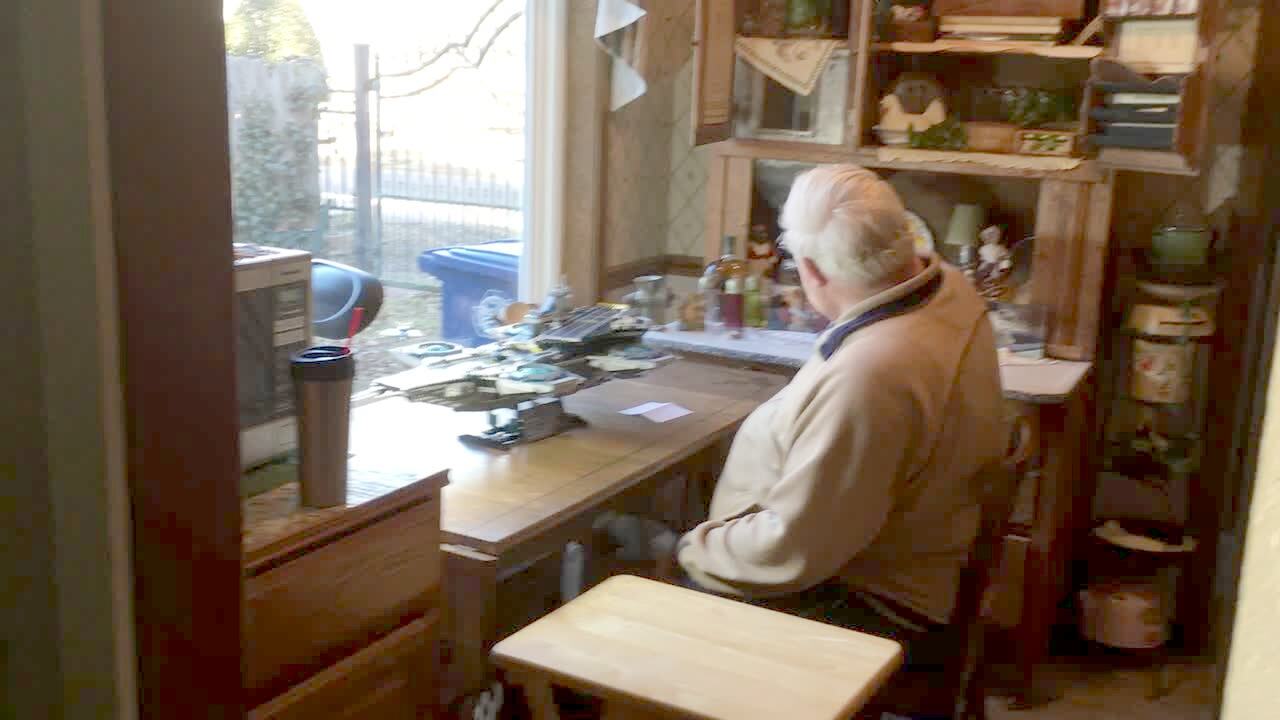 A senior man jumps up and down while a Boston terrier dog watches and then jumps on his leg.