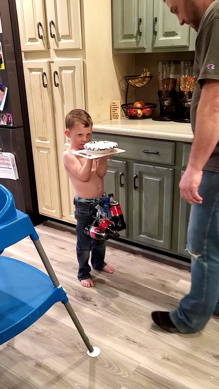 A man attaches several bottles of soda hanging from strings to the arms of a young boy and then asks the boy to hold a tray with a cake on it in front of his face. The man cuts the strings with a pair of scissors which throws off the weight balance and causes the cake to smash into the face of the boy.